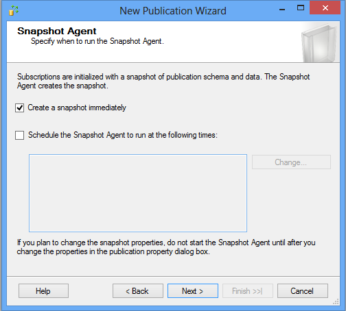 The Snapshot Agent is an executable file that prepares snapshot files containing schema and data of published tables and database objects, stores the files in the snapshot folder.