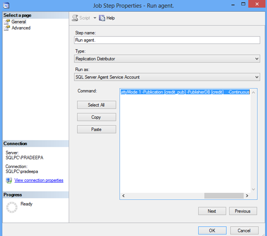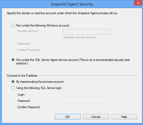 Specify the domain or machines account under which the distribution agent process will run and click ok.